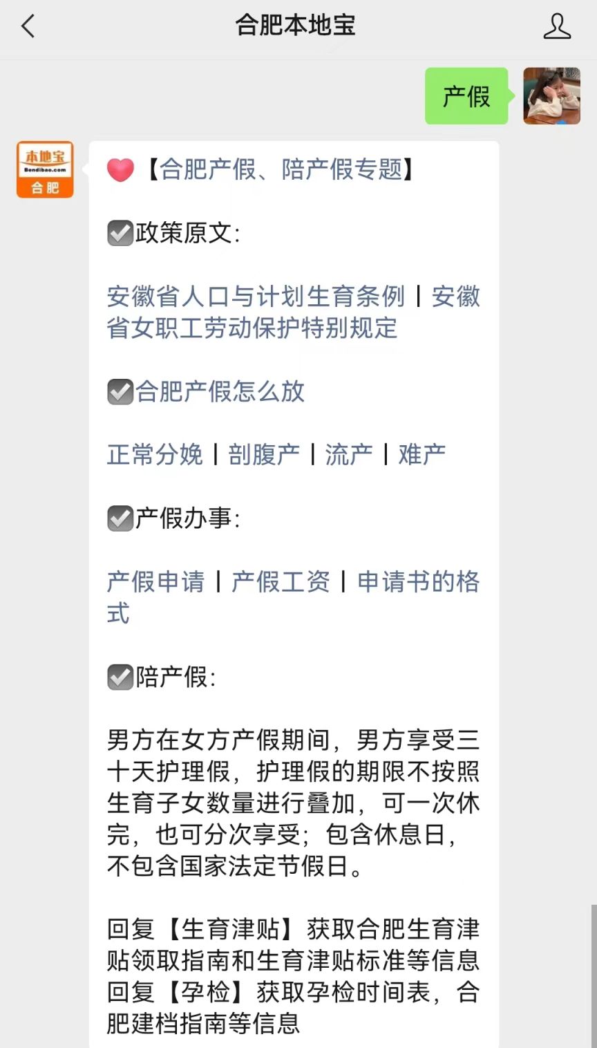 温馨提示:微信搜索公众号合肥本地宝,关注后在聊天对话框回复【产假】可获合肥产假放假安排、工资、时间,男性陪产假安排,育儿假安排以及生育津贴领取等信息。